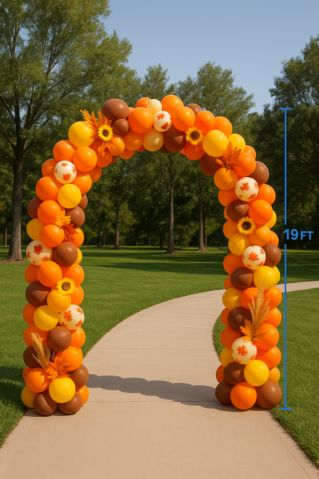 Make a stunning statement with this 19-foot Thanksgiving-themed balloon arch! Styled with warm autumn colors—orange, yellow, brown, and cream—and detailed with sunflowers, faux leaves, and fall accents, it creates the perfect festive entrance or photo moment.